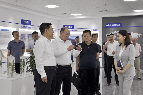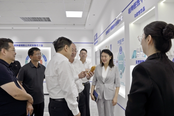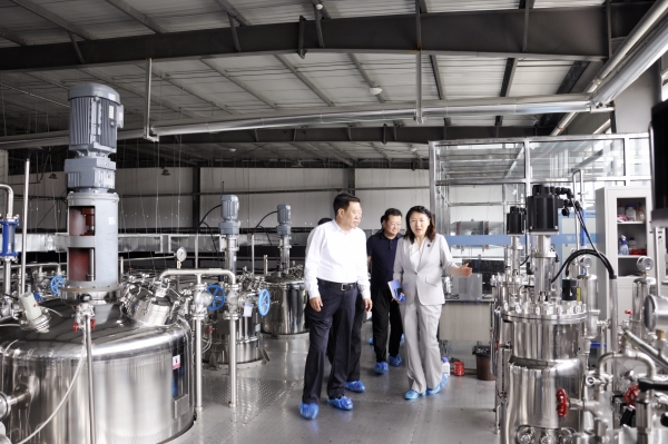 最后,领导们参观了集团的发酵车间。在这里,通过集团研发的植物胚性干细胞(PESC)技术,可将10毫升的细胞悬浮液(液体)经过50升、500升、5吨、10吨的规模化培养,28天可产出约7.5吨的细胞悬浮液。